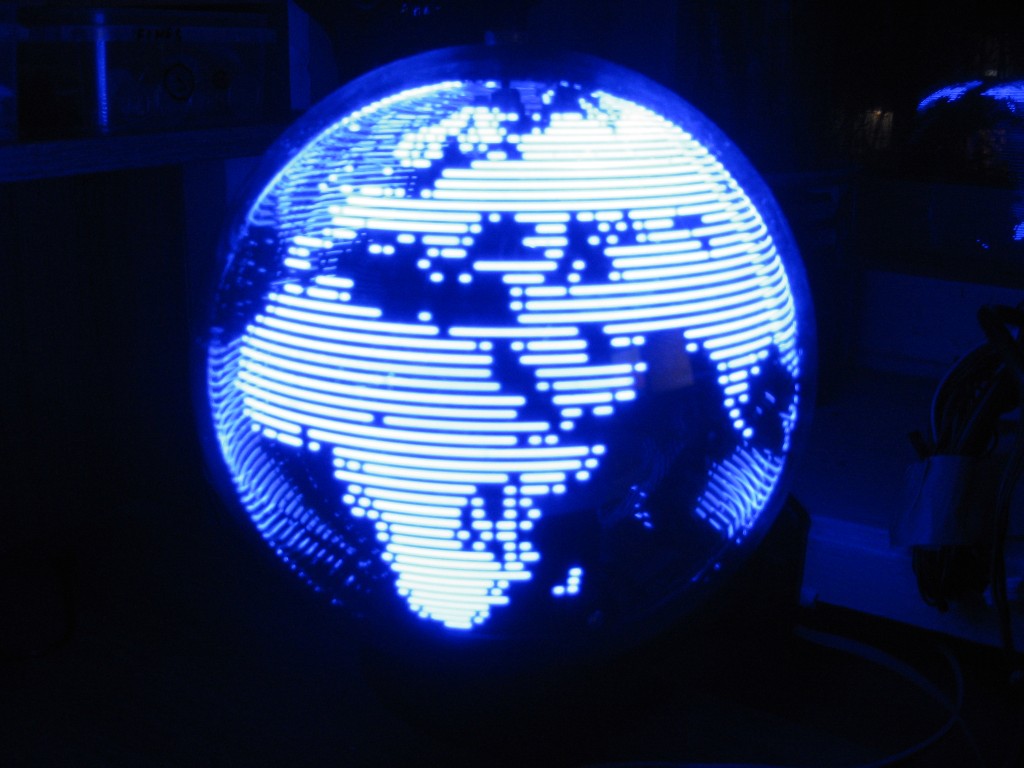 Данная система предназначена для отображения информации сферической формы. Эта система обладает относительно высокой плотностью точек, которая достигается по принципу, представленному в следующем изображении. На дуговых поверхностях светодиоды расположены в шахматном порядке. Во время вращения такая конструкция формирует целостную картинку, визуально кажется, что светодиоды стоят вплотную друг к другу. К достоинствам такой конструкции также можно отнести – равномерное распределение веса и как следствие минимизация вибрации.