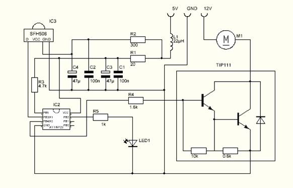 Управление двигателем реализовано посредством ИК связи (RC-5). Под управлением подразумевается установка скорости (0-15). Сердечком драйвера выступает Attiny45.