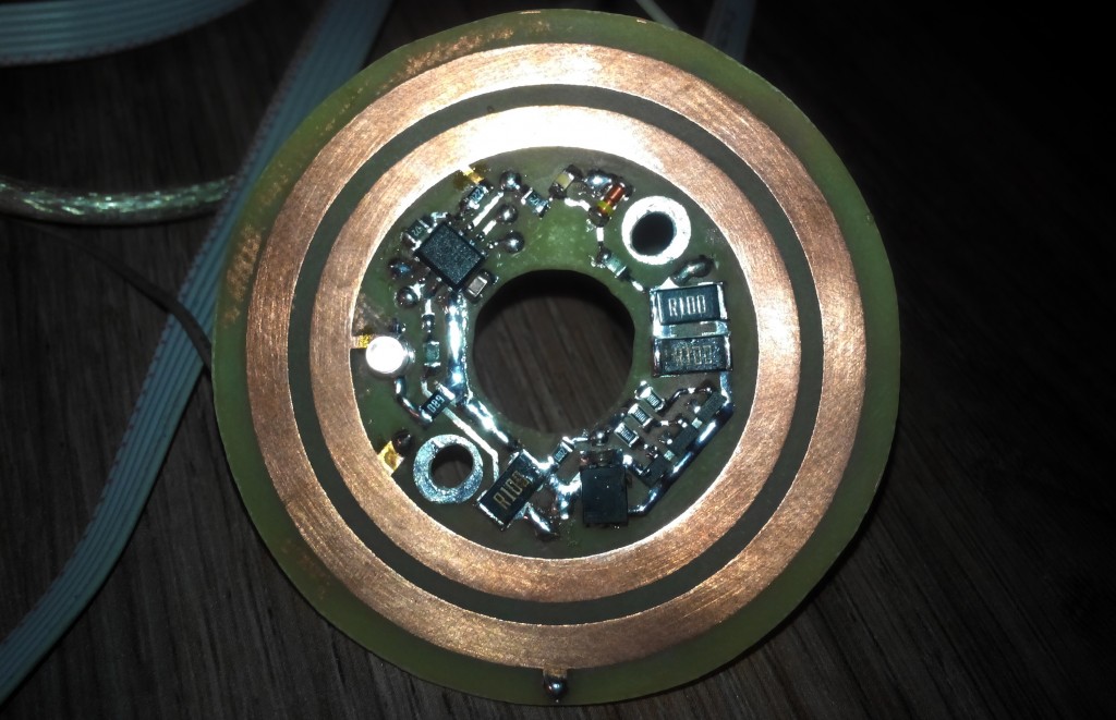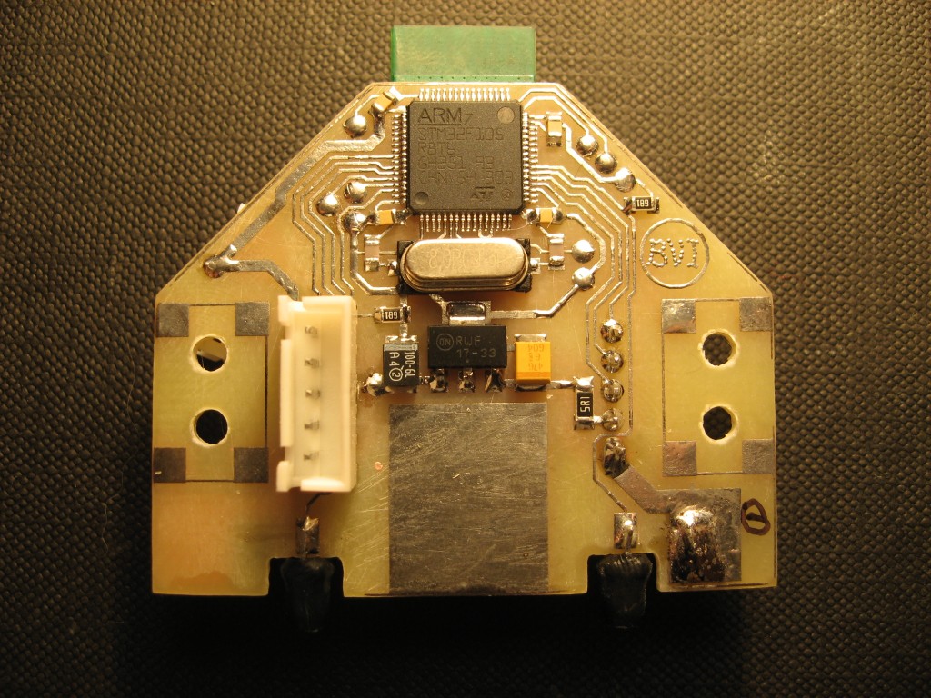 На следующем изображении представлена плата управления двигателем. Этот модуль формирует импульсы ШИМ, что позволяет задать необходимую скорость вращения оси двигателя. Система управления двигателем оборудована токовыми шунтами. Первый – защищает двигатель от перегрузки. Второй – позволяет останавливать или запускать двигатель по команде с вращающейся части.
