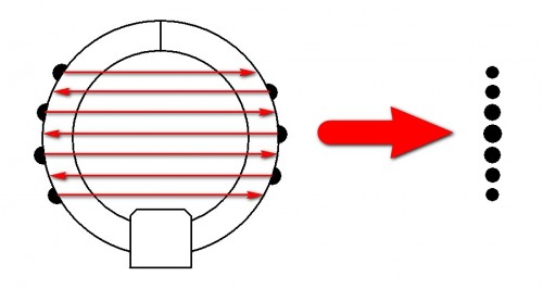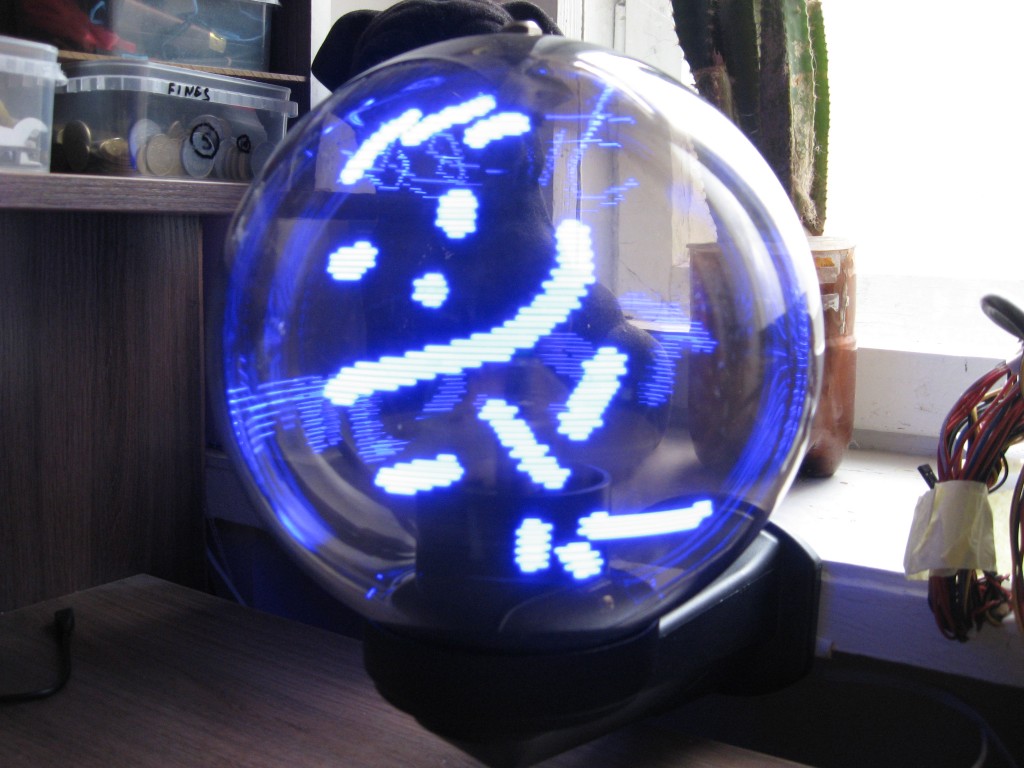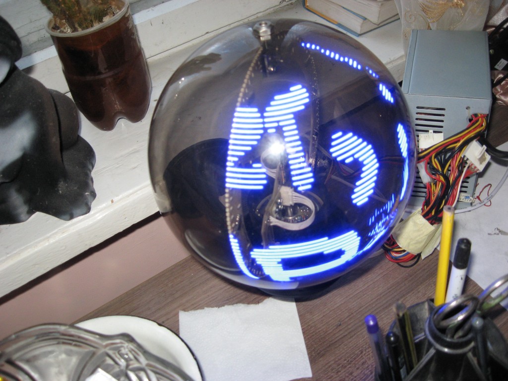 Данная система предназначена для отображения информации сферической формы. Эта система обладает относительно высокой плотностью точек, которая достигается по принципу, представленному в следующем изображении. На дуговых поверхностях светодиоды расположены в шахматном порядке. Во время вращения такая конструкция формирует целостную картинку, визуально кажется, что светодиоды стоят вплотную друг к другу. К достоинствам такой конструкции также можно отнести – равномерное распределение веса и как следствие минимизация вибрации.